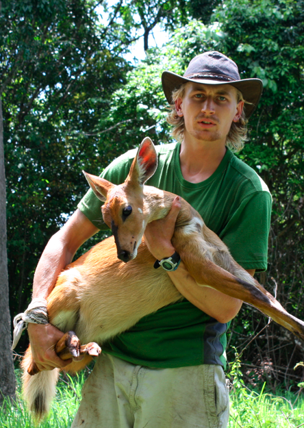 So as I’ve already said, poachers are very active in these parts. The poachers kill catch their quarry in one of two ways; either with a gun or with a trap. Part of our work is therefore the removal of any traps that we come across. On this day however we sadly came across a trap that had already caught an animal. It was a Pongo which is a medium sized antelope that on first glance seemed very dead. As we approached though our dead Pongo swung its head in alarm. Not dead. This was a welcome surprise but it still looked in a bad way. The poor thing was clearly exhausted, It could have been struggling in the trap for over 24 hours. Its head was lolled back over its shoulder and the leg that was caught in the trap was strung awkwardly above it so at once we set about freeing the poor bugger. Busoti bent the pole whilst I pinned down animal and set about cutting it free of the trap. Once clear I lifted him out of the bush, he’d got himself tangled in during his struggle, and into a small clearing. Here I was able to clear its head of ticks and give it some water. It was a real Dolittle moment. After a few minutes of grooming, I got off him and let him go but in his sudden panick stricken freedom, he got up and ran straight into another bush. A second later he struggled free of the bush and ran back into the clearing only to crash to the ground 20 m from us. He did not get up. We waited near him for a good half an hour to let him gain his strength before urging him to find a better hiding place (the middle of a clearing is no place for an injured antelope!). This he did, and without crashing to the floor or any bushes. So there you have it, hopefully he’ll survive.